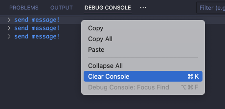 You can clear the console by right-clicking inside the logs panel and choosing the Clear Console option or using the ⌘ K shortcut.
